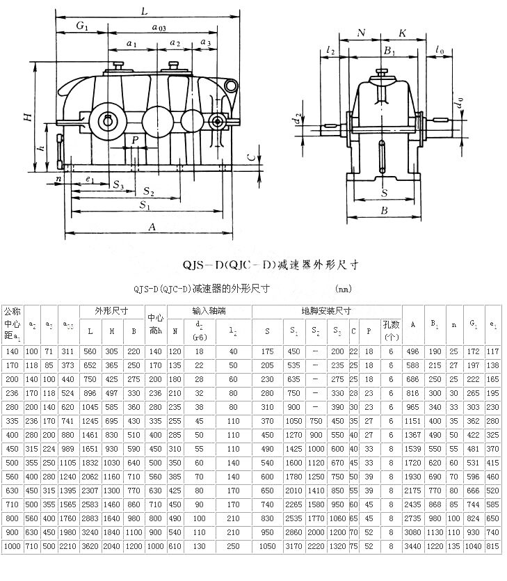 1)结构型式 QJ-D型减速器分为:QJR-D(QJB-D)型为二级,QJS-D(QJC-D)型为三级。QJRS-D(QJD-D)型为二级安装尺寸三级速比。